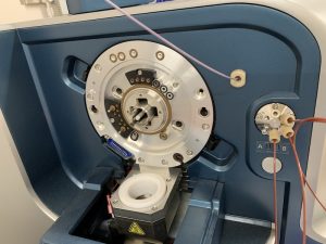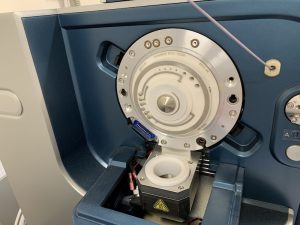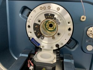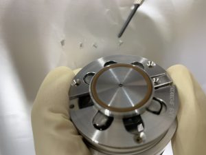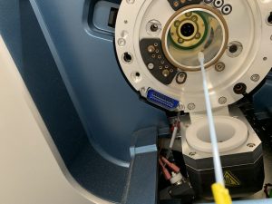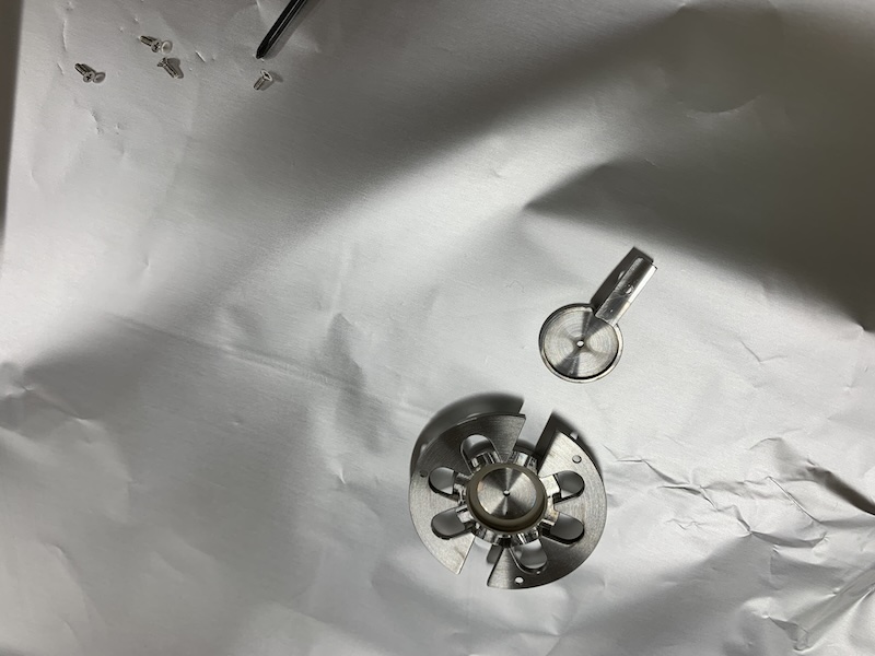 これ、外せますが、取り付ける向きは逆向きでもつけられるんですよね。ですが、逆向きでつけてしまうと QJet を本体に正しく入れられなくなります。InterQuad 0 は四重極の模様に汚れがついています。メタノールをしみ込ませたキムワイプやスワブでふき取ります。