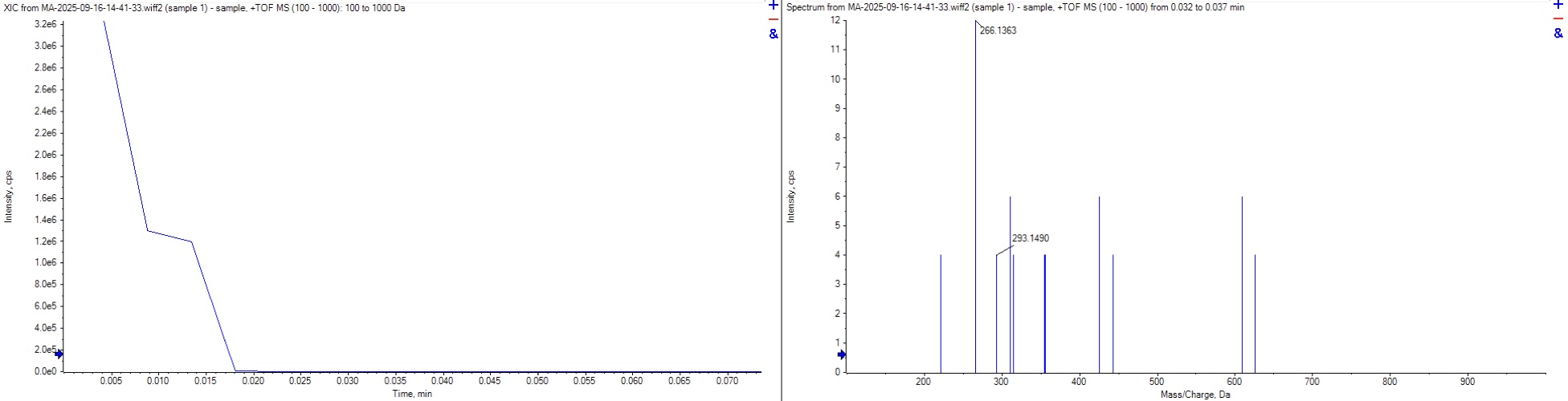 ESI の極性を Pos → Neg に変更すると、Neg で瞬間的にマススペクトルが見えるようになりますが、次第にまた何も見えなくなります。Neg → Pos にするとまた瞬間的に見えるんですよね。ESI ではスプレーしているエレクトロードとオリフィスの間には正イオンモードの時 5500 V という高電圧がかかっています。 どうやら、この領域が汚れていると、汚れに電荷がたまることが起こるようです。大気圧と高真空の境界であるジェット領域が天然のコンデンサーになってしまい、イオンに別の電圧をかけてしまうという。汚れが帯電していないうちはイオンが普通にこのジェットを通り抜けるのですが、汚れが充電されるとイオンの通過を妨げるようになります。ですが、極性を入れ替えると溜まった電荷が放出されるので、またイオンが見られるようになるものの、また逆に帯電するとそのうち、イオンの通過を妨げるようになる、と。なので、極性を入れ替えると汚れコンデンサーが充電されるまではイオンが検出できるということのようです。
